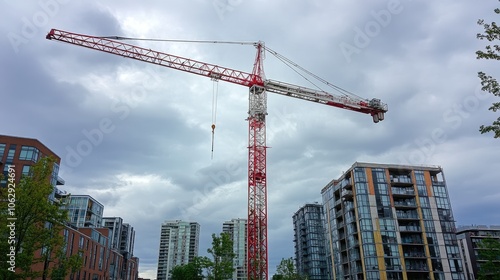 Tower crane with red and white accents reaching up into a cloudy sky, framed by urban development in progress