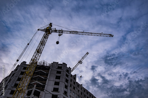construction, tower, unfinished, skyscraper, multistorey, crane, building, architecture, block, blue, city, city landscape, cloud, concrete, construction site, development, dusk, dwelling, engineering, equipment, estate, facades, machine, project, scene, site, sky, skyline, structure, tall, technology, urban, view, work, workplace, background, build, cement, evening, growth, house, lift, modern, sunset, complex, elevating, huge, incomplete, property