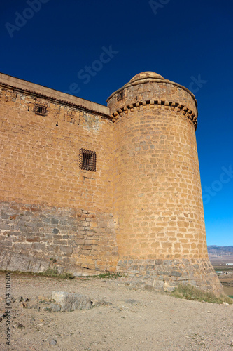 Towers of medieval spanish castle La Calahorra on the hill against azure winter sky