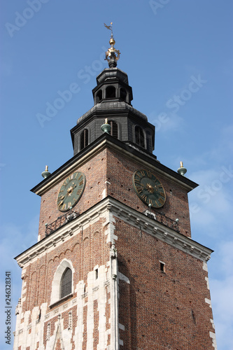 city hall, tower, clock, krakau, architecture, church, sky, building, blue, europa, old, religion, cathedral, bell, ancient, city, travel, landmark, history, mediaeval, tour tourism, facades, gothic style, church steeple, church steeple, outdoors, brick, cloud, brickwork, town, poland, nobody