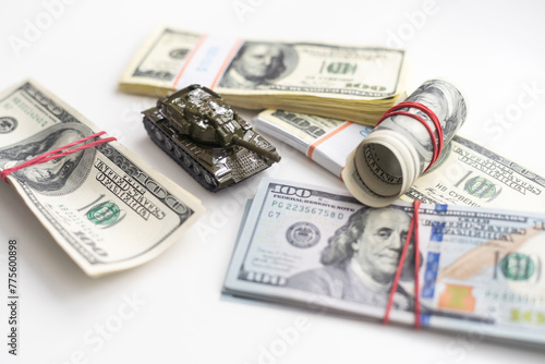 Toy tank on US hundred dollar bills banknotes close up. The concept of war costs, military spending and economic crisis