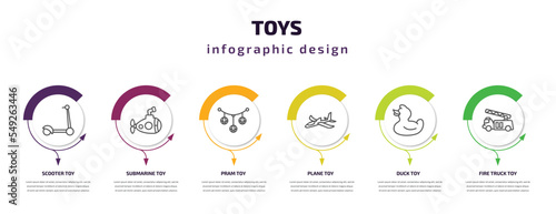 toys infographic template with icons and 6 step or option. toys icons such as scooter toy, submarine toy, pram toy, plane duck fire truck vector. can be used for banner, info graph, web,
