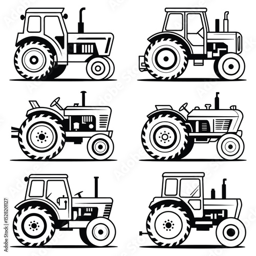 tractor icon set – 6 different farm vehicle vector silhouettes