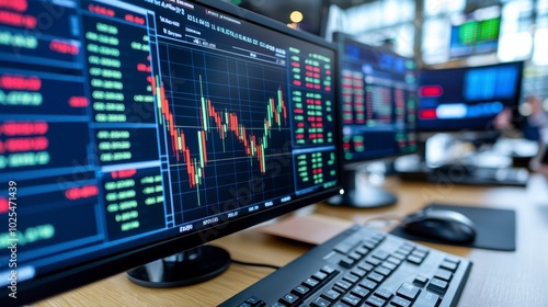 Trading Floor Monitors, Stock Charts Display, Market Data Analysis, Finance Technology, Investment Environment