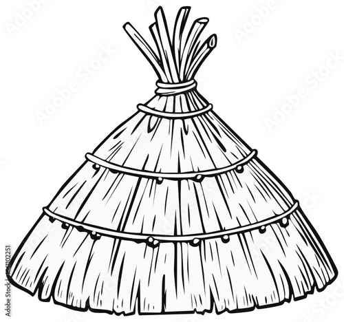 thatched roof, thatch, roof, hut, hovel, dwelling, shelter, straw, hay, grass, reed, reed, rope, illustration, drawing, line art, outline, vignetting, doodle, cartoon, black-and-white, monochrome, icon, symbol, vector, graphic, traditional, tribal, tribe, africa, african, village, rural, primitive, ancient, culture, indigenous, native, architecture, construction, conical, cone, peak, hand-made, tiered