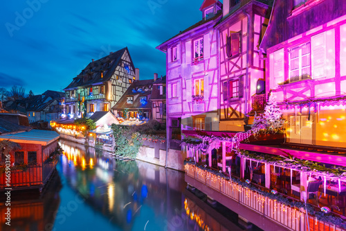 Traditional Alsatian half-timbered houses in Petite Venise or little Venice, old town of Colmar, decorated and illuminated at christmas time, Alsace, France