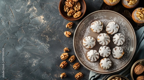Traditional Arabic cookies with date and walnut filling topped with powdered sugar Celebration of Eid or Ramadan Top view with empty space