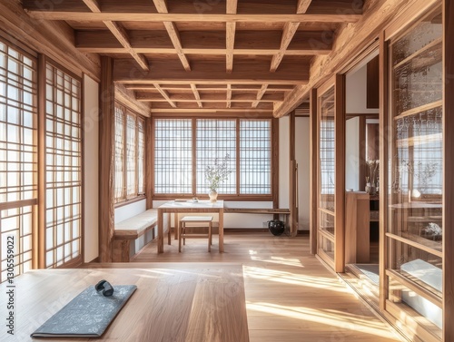 wood, interior, design, architecture, japanese, asian, room, window, ceiling, beam, light, natural, open, floor, table, bench, chair, minimalist, style, calm, serene, pattern, grid, frame, panel, sliding, door, space, traditional, modern, structure, clean, neutral, aesthetic, simplicity, furniture, decorative, vase, plant, mat, detail, perspective, hardwood, craftsmanship, elegant, bright, roomy