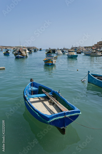 Traditional colorful boats in the Harbor of Mediterranean fishing village Marsaxlokk, Malta