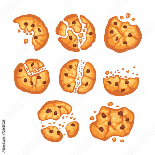 Traditional cookies with chocolate crisps, Bitten chip cookie, Bitten and broken cookie with chocolate. Vector illustration isolated on white background.
