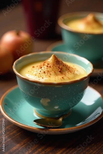Traditional Egyptian Revani dessert served in a delicate ceramic cup, garnished with a sprinkle of cinnamon, food , Middle Eastern