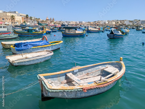 Traditional fishing colorful boats Luzzu in Marsaxlokk harbor at sunny day. Malta.