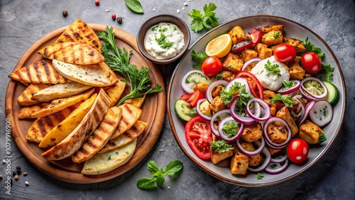 Traditional Greek cuisine featuring Greek salad, chicken souvlaki