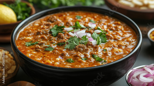 Traditional hearty bowl of haleem with herbs and fried onions, close-up of delicious dish