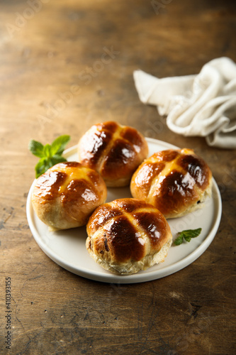 food, pastry, easter, bun, jam, nobody, dough, bun, religious, spring, seasonal, sweet, fresh, baked, cake, dessert, traditional, celebration, holiday, hot, cross, treat, bread, symbol, board, wooden, background, knife, raisin, homemade, tradition, english, up high, christian, top, view, rustic, meal, plate, breakfast, snack