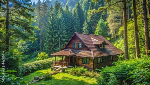 Traditional house surrounded by lush forest trees, forest, woods, cabin, nature, rural, cozy, home, architecture, traditional