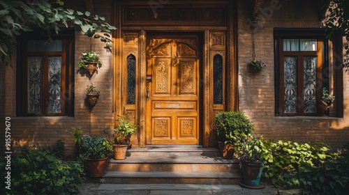 Traditional house with a beautifully carved wooden door and vintage windows, giving a warm and inviting appearance.