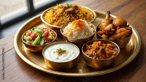 Traditional Indian or Bangladeshi Food Thali – Biryani, Curry, Rice, Raita, Chicken, Authentic Asian Cuisine