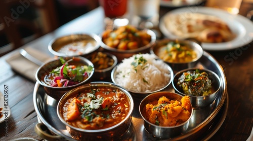 Traditional Indian thali meal served on a stainless steel platter, featuring a variety of curries, rice, and breads.