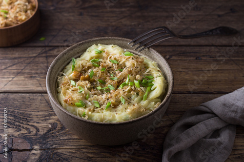 Traditional Irish dish colcannon, mashed potatoes with cabbage and green onions, on top of crispy fried cabbage topping with nuts and spices on wooden table