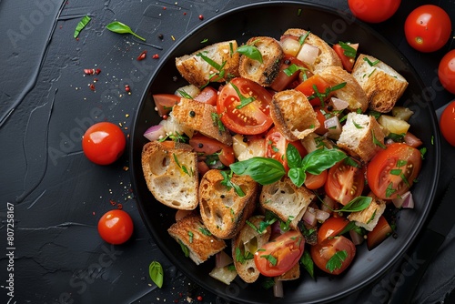 Traditional Italian vegetarian Tuscan panzanella salad with tomatoes and toasted bread on a black background from a top view