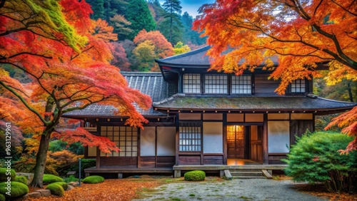 Traditional Japanese house surrounded by colorful maple leaves in autumn , Japan, traditional, house, maple leaves, autumn