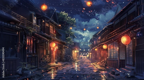 japan, street, night, lantern, traditional, japanese, illustration, nightscape, cobbled, cultural, heritage, serene, nostalgic, starry sky, tranquil, peaceful, scenic, aesthetic, travel, art, digital artwork, village, historic, picturesque, evening, ambience, mood, architecture, dusk, twilight, asian, oriental, lighting, scene, artwork, nightlight, calm, vintage, charming, cosy, soft light, generative, ai
