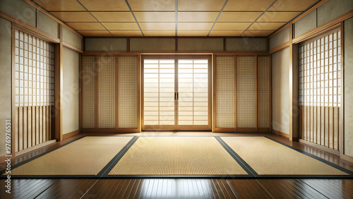 Traditional Japanese tatami mat in a minimalist room with shoji screens, Japanese, tatami mat, minimalist, room