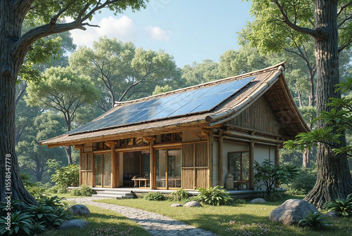 Traditional Japanese Wooden House with Solar Panels in Forest Setting