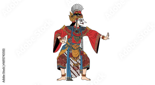 traditional, cultural, indonesian, javanese, puppet, character, masked, costume, dance, performing arts, folklore, mythology, asian, southeast asia, illustration, vector, drawing, stylised, graphic, art, artistic, vibrant, colourful, ancient, heritage, symbol, icon, decorative, entertainment, theatre, drama, warrior, hero, god, travel, tour tourism, education, history, balinese, spiritual, ritual