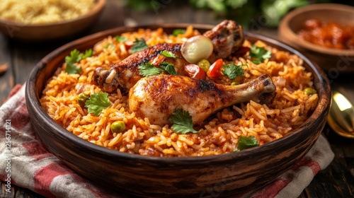 rice, chicken, traditional, hearty, flavorful, dish, texture, spice, food, cultural, theme, detailed, realistic, digital, high, quality, comforting, delicious, closeup, prepared, epicure, meal, fresh, homemade, vibrant, dining, cookery, close-up view, tasty