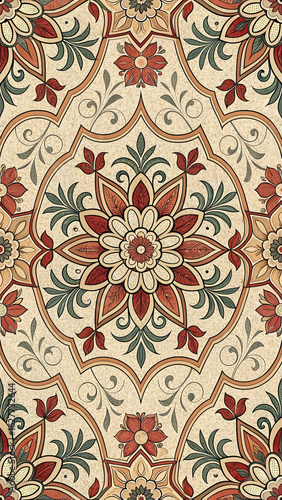 traditional Middle Eastern or Indian-style ornamental seamless pattern in red, green,and cream colors.This image can be used as background on websites or blogs about ethnic art,carpets,interior design