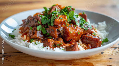 Traditional peruvian lomo saltado: stir-fried beef and vegetables with white rice, tomato, and parsley garnish on wooden table