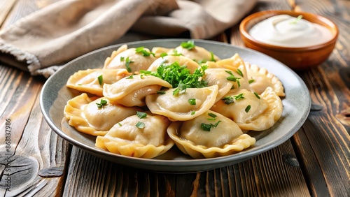 Traditional Polish pierogi served with a dollop of tangy sour cream , Polish, cuisine, food, dumplings, traditional