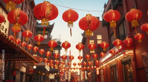 Traditional red lanterns decoration in Asian street. Cultural festival and celebration.