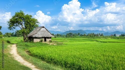 bungalow, rice field, rural area, blue skies, nature, agriculture, farmhouse, serenity, farming, countryside, summer day, flora, thatched roof, sky clouds, calmness, scenic view, harvesting, mountain view, vegetation, greengrass, small house, habitat, open space, farmland
