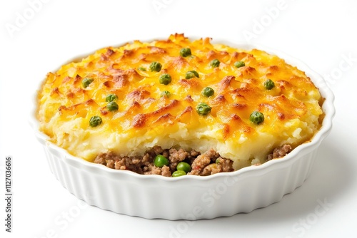 Traditional shepherd’s pie in a white baking dish, golden mashed potato topping with visible filling.