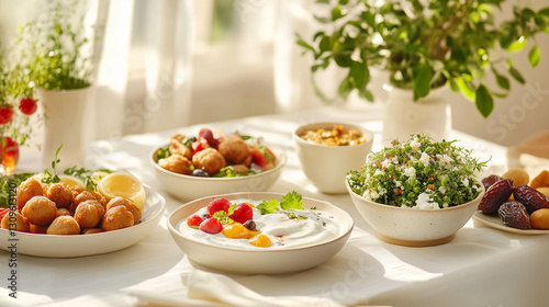 breakfast, traditional, fresh, healthy, sunlit, date, yogurt, salad, dining, morning, meal, ramadan, fasting, nourishment, cultural, authentic, homemade, organic, wholesome, bright, airy, natural, decorative, appetising, preparation, cookery, mediterranean, dietary, seasonal, refreshing, nourishing, abundance, platter, arrangement, daybreak, dawn, ritual, ceremonial, blessed, mindful, presentation, gastronomy, flavorful, sustenance, balanced, culinary