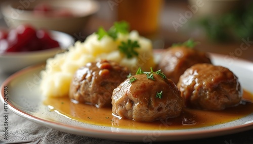Traditional Swedish meatballs called Kottbullar served on plate with creamy gravy, mashed potatoes, cranberry sauce. Delicious, hearty meal perfect for dinner lunch, offering taste of classic