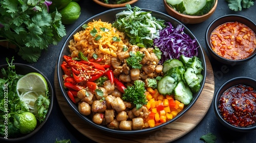 Traditional Thai food served on a wooden table, featuring vibrant spices, fresh herbs, and colorful presentation