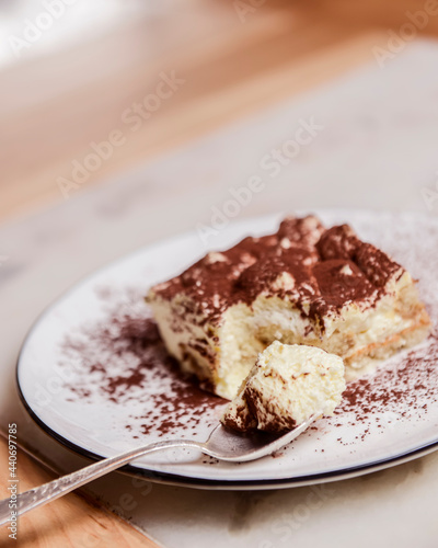 Traditional Tiramisu Cake served on a white plate over wooden background. Italian French cuisine concept