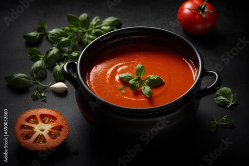 Traditional tomato soup with basil in a bowl on dark background. Commercial promotional food photo