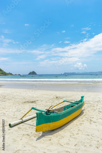 Traditional wooden boat park at sea shore with cloudy skies at South Lombok island, Indonesia
