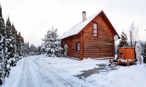 Traditional wooden house in the snow. Winter in Europe. Lithuania.