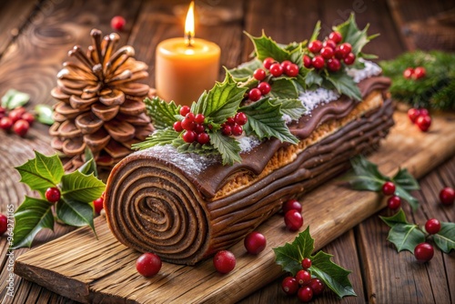 Traditional Yule log cake with holly leaves and berries on a rustic wooden table, warm candlelight