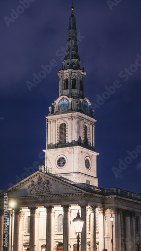 Trafalgar Square Landmark: Church Spire and Portico After Dark