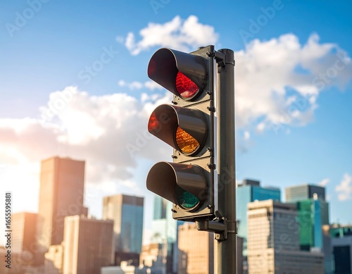 traffic, light, signal, red, yellow, green, city, skyline, sunset, urban, building, modern, architecture, daylight, cloud, sky, horizon, pole, road, safety, transport, infrastructure, view, photo, transportation, bright, summer, evening