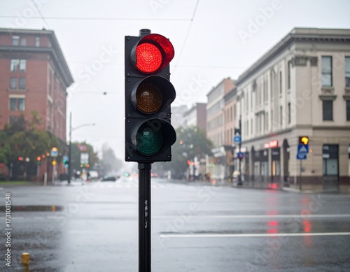 traffic light, stop, road, urban, city, street, downtown, red, architecture, building, transportation, signal, safety, infrastructure, intersection, outdoors, day, blurred background, wet, rainy day, city landscape, building, vehicle, pavement, travel, commerce, business, us, us, america