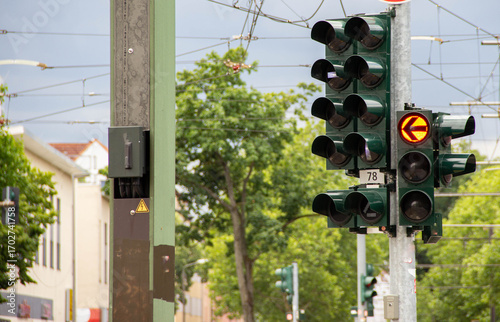 traffic, signal, red, light, left, turn, urban, architecture, safety, navigation, green, tree, transportation, city, street, infrastructure, warning, design, environment, signalling, road, vehicle, direction, communication, public, transport, pedestrian, movement, travel, landscape, modern, technology, illumination, daylight, structure, system, urbanism, signage, indication, awareness, city landscape