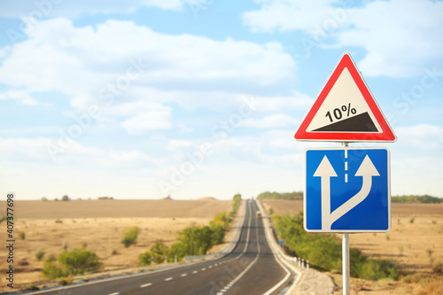 Traffic signs near empty asphalt highway. Road trip